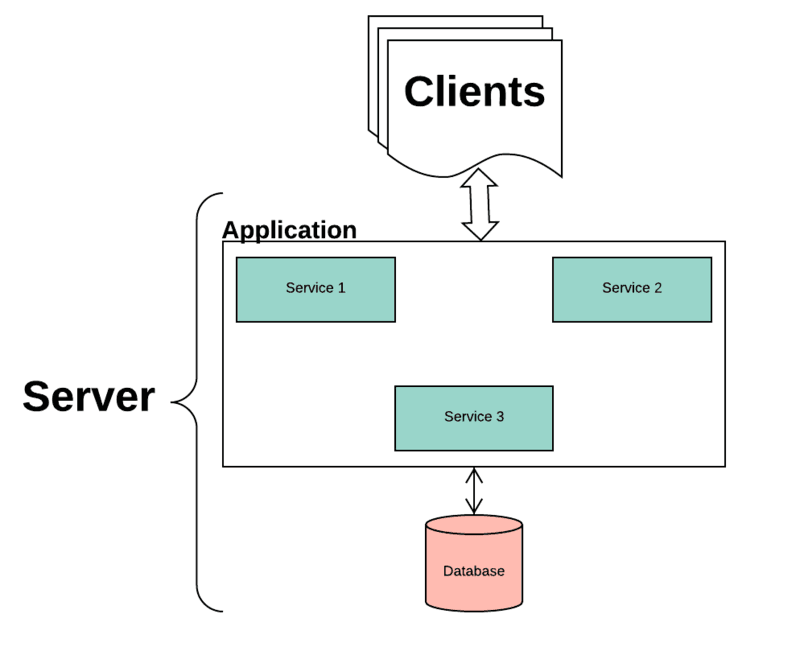 在单体应用程序中,所有这些服务都在同一个应用程序层上运行,因此这个电子商务网站的软件架构如下所示: