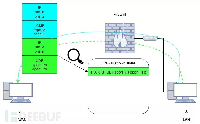为了说明这个概念,让我们考虑以下示例。在一个简单的网络中,我们希望只允许LAN上的主机通过端口1234上的UDP与WAN上的任何主机联系。但我们仍然希望A接收带外错误。在这种情况下,将使用以下高级防火墙配置: