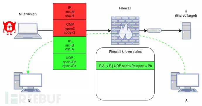 使用恶意制作的ICMP [v6]数据包可以滥用此行为,该数据包以过滤的主机为目标,同时封装符合合法状态的数据包,如下所示: