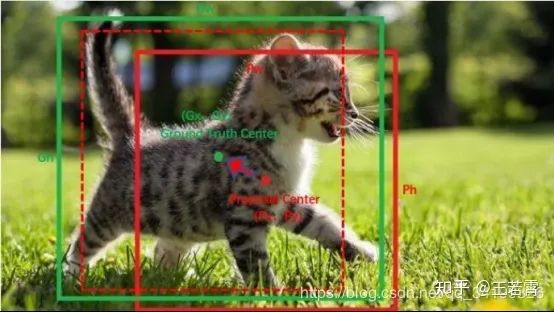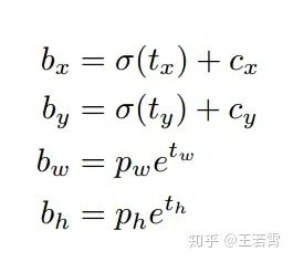 但是在yolov3中与faster-rcnn系列文章用到的公式在前两行是不同的,yolov3里Px和Py就换为了feature map上的grid cell左上角坐标Cx,Cy了,即在yolov3里是Gx,Gy减去grid cell左上角坐标Cx,Cy。x,y坐标并没有针对anchon box求偏移量,所以并不需要除以Pw,Ph。