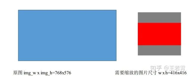 这里需要注意的是,虽然输入尺寸是416*416,但原图是按照纵横比例缩放至416*416的, 取 min(w/img_w, h/img_h)这个比例来缩放,保证长的边缩放为需要的输入尺寸416,而短边按比例缩放不会扭曲,img_w,img_h是原图尺寸768,576, 缩放后的尺寸为new_w, new_h=416,312,需要的输入尺寸是w,h=416*416.如图2所示: