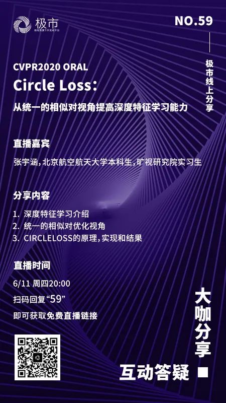 就在明天,极市直播第59期:Circle Loss,从统一视角提升深度特征学习能力。本次直播,我们重磅邀请到Circle Loss论文作者之一:来自北京航空航天大学的张宇涵,为我们深度解读这一工作的思路原理以及实现结果。请大家锁定直播时间(6/11晚20:00)。详情戳这里,在极市平台后台回复“59”,即可获取直播链接。