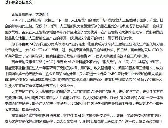 李彦宏在内部信中强调,“百度需要更快建成以人工智能为中枢、以大数据为依托、以云计算为基础的ABC三位一体深度结合的智能云。”