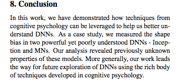 在标准神经网络架构中发现这种以前无法识别的偏见说明了使用人工认知心理学解释神经网络解决方案的潜力。在其他领域,情景记忆文学的见解可能对于了解情景记忆体结构是有用的,并且来自语义认知文献的技术可能有助于理解最近的概念形成模型。其他领域的丰富心理学文献,有可能给我们强大的新工具来解决“黑匣子”问题,更深入地了解神经网络的行为。
