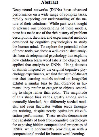 导读:DeepMind最近通过认识心理学研究深度神经网络案例:我们从发展心理学中选择了一个完善的分析,解释了儿童如何学习对象的单词标签,并将该分析应用于DNN。使用由原始认知心理学实验启发的刺激数据集,我们发现在ImageNet上训练的最先进的一次学习模型显示出与人类观察到的相似的偏好:他们更喜欢根据形状而不是颜色对对象进行分类。这些结果证明了认知心理学工具能够揭示DNN的隐藏计算属性,同时为人类学习提供了一个计算模型。