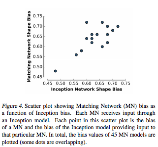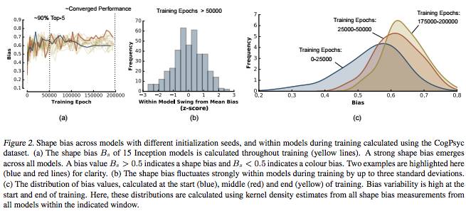 我们观察到,在我们网络的早期训练过程中,形状偏好逐渐出现。这让人联想到人类形状偏好的出现:心理学家已经观察到,幼儿的形状偏好比年龄较大的孩子小,成年人显示出最大的偏好。