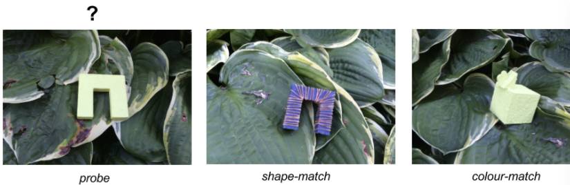 我们采用的经典形状偏差实验如下:我们向深度网络呈现三个对象的图像:探针对象,形状匹配对象(相同形状,不同颜色)和颜色 - 匹配对象(相同颜色,不同形状)。然后,我们测量形状偏好作为探测图像被分配与形状匹配图像相同的标签而不是颜色匹配图像的时间的比例。