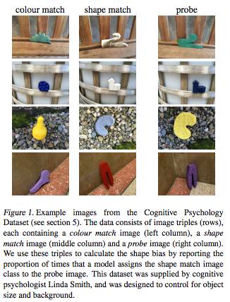 选择测量我们神经网络的形状偏差,因为在人类学习这种偏见的研究中,有一个特别大的研究对象。