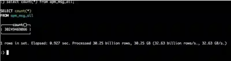 集群部署 4 台机器,每台机器配置 :CPU E5-2620@2.00GHz ,开启超线程后 24core ,48g 内存,3T × 12 Raid5Select count(*) 300 亿 数据 0.9 秒