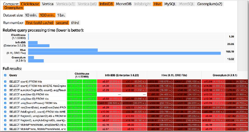 Yandex 在 2016 年 6 月 15 日开源了一个数据分析的数据库,名字叫做 ClickHouse,这对保守俄罗斯人来说是个特大事。更让人惊讶的是,这个列式存储数据库的跑分要超过很多流行的商业 MPP 数据库软件,例如 Vertica。如果你没有听过 Vertica,那你一定听过 Michael Stonebraker,2014 年图灵奖的获得者,PostgreSQL 和 Ingres 发明者(Sybase 和 SQL Server 都是继承 Ingres 而来的), Paradigm4 和 SciDB 的创办者。Michael Stonebraker 于 2005 年创办 Vertica 公司,后来该公司被 HP 收购,HP Vertica 成为 MPP 列式存储商业数据库的高性能代表,Facebook 就购买了 Vertica 数据用于用户行为分析。