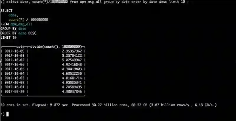 select date, count(*) from xx group by date ,300 亿数据 group by 日期 查询 9.8 秒
