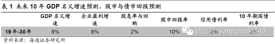 其中债市中的信用债或有望提供5%左右的票息回报,与之相应10年期国债利率或保持在3%左右。如果利率水平保持稳定,那么股市的估值水平将保持平稳,但是依靠7-8%的盈利增速和2%的股息率,A股提供的年均回报率有望达到10%左右。这其实是长期的股债慢牛行情。