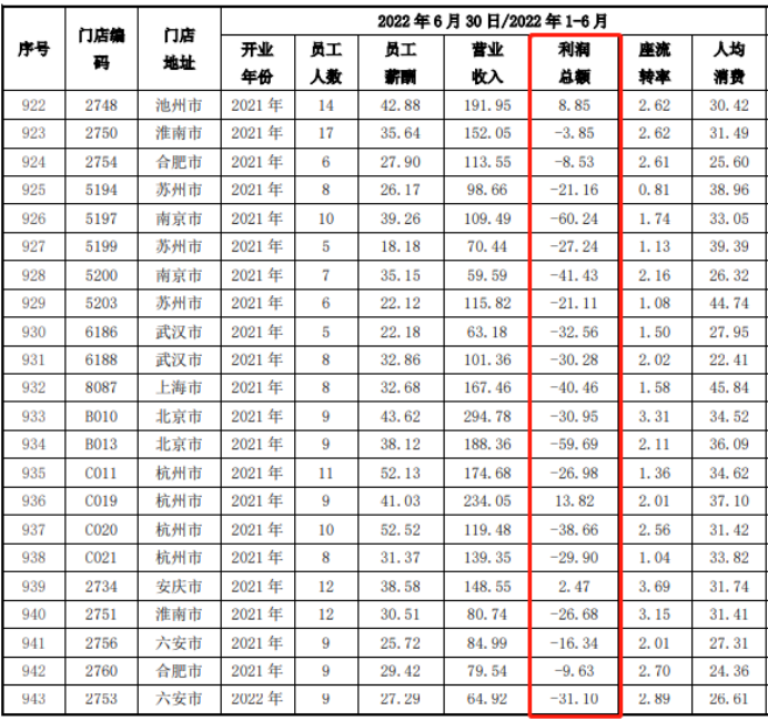 招股书显示,一般情况下老乡鸡新店达到收支平衡所需的时间为9-18个月。如图,截至2022年6月底,2021年新开业的南京、武汉等安徽省外门店多数目前仍处于亏损状态。