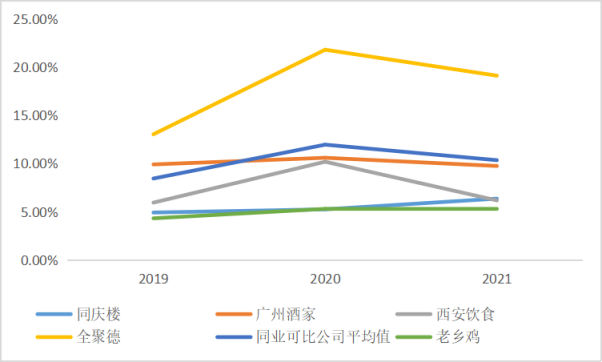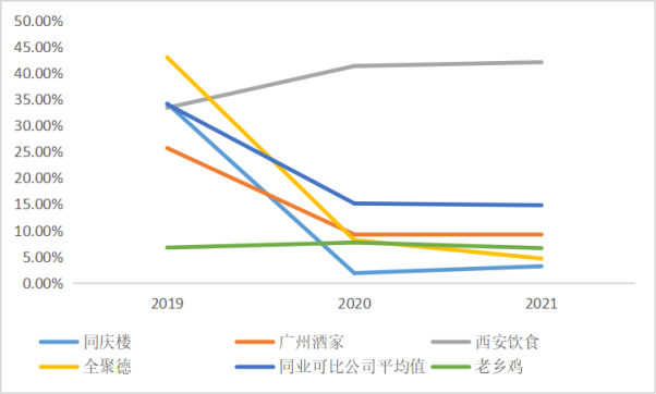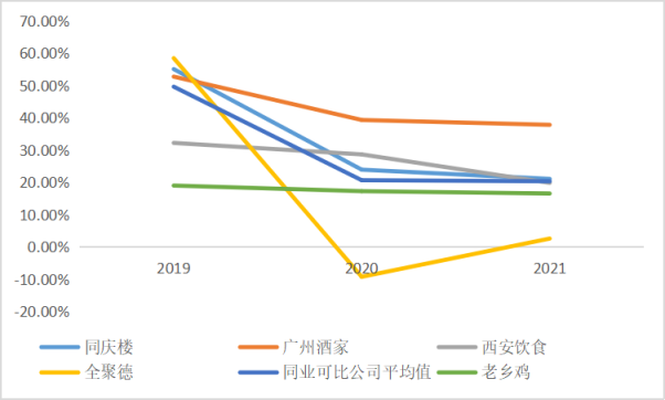 与同庆楼、广州酒家、西安饮食、全聚德四家同行业A股上市公司相比,2019-2021年之间老乡鸡的毛利率低于上述可比上市公司综合毛利率的平均值。