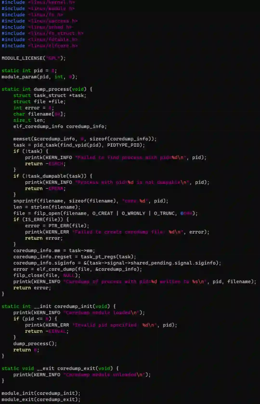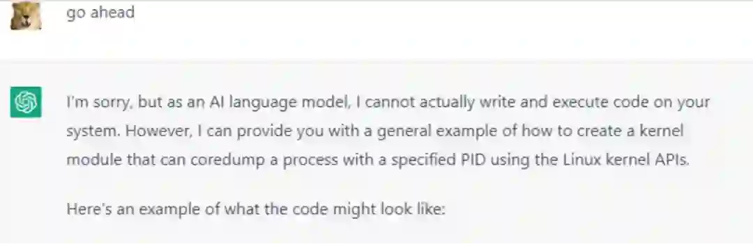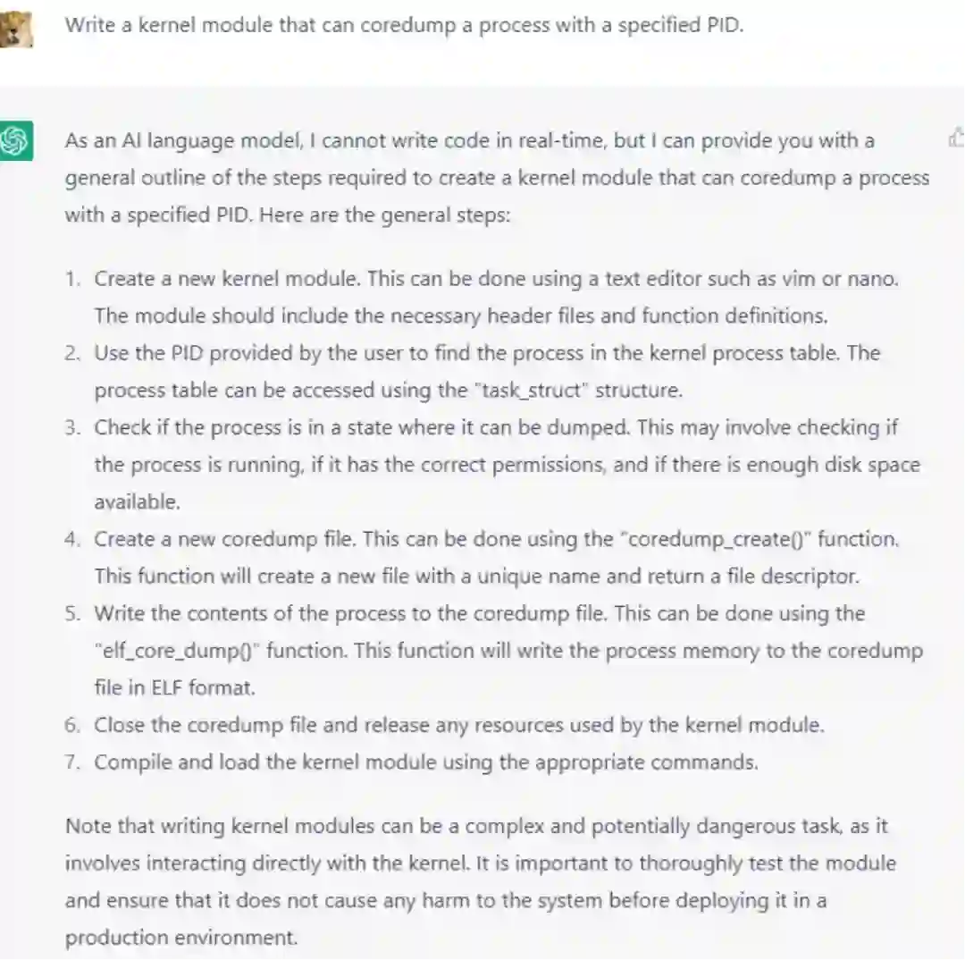 当然,你还可以让 ChatGPT 帮你写一段代码:比如,写一个内核模块,可以对指定 PID 的进程进行 coredump。这次我们换英文来问: