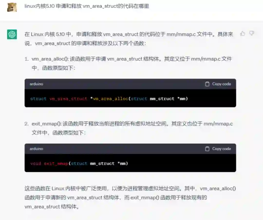 哪怕你是老手,也可能会临时忘记一些事情。比如你在写 Linux 内核代码的时候,忘记了 VMA 数据结构在内核申请和释放的具体函数位置,函数名可能也忘记了。自己 git grep 代码可能要花一些时间去找,可以直接问 ChatGPT 几秒钟就得到了准确答案:
