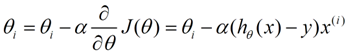 下面是更新的过程,也就是θi会向着梯度最小的方向进行减少。θi表示更新之前的值,-后面的部分表示按梯度方向减少的量,α表示步长,也就是每次按照梯度减少的方向变化多少。