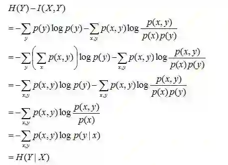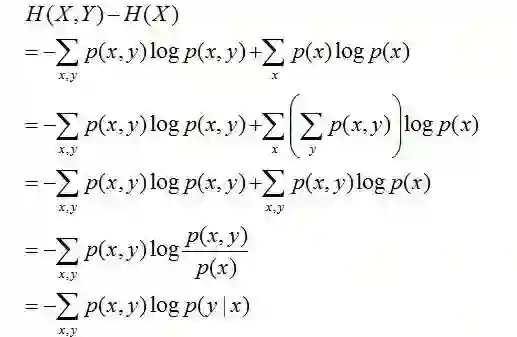 且有此式子成立:H(Y|X) = H(X,Y) – H(X),整个式子表示(X,Y)发生所包含的熵减去X单独发生包含的熵。至于怎么得来的请看推导: