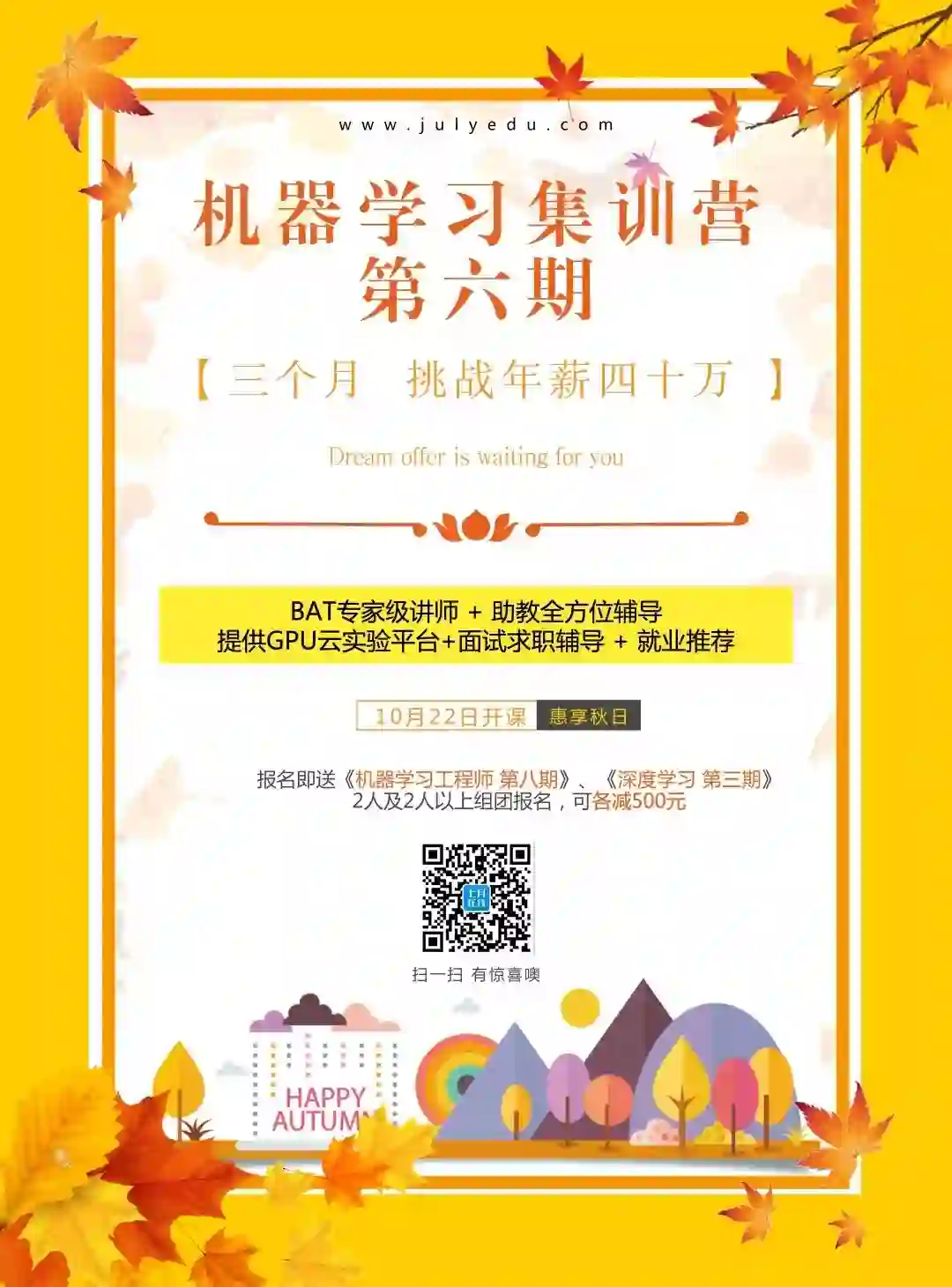 福利时刻:为了帮助大家更加系统地学习机器学习课程的相关知识,我们特意推出了【机器学习集训营 第六期】系列课程。10月22日开课,2人及2人以上组团报名,可各减500元,还没报名的小伙伴们抓紧时间喽~~