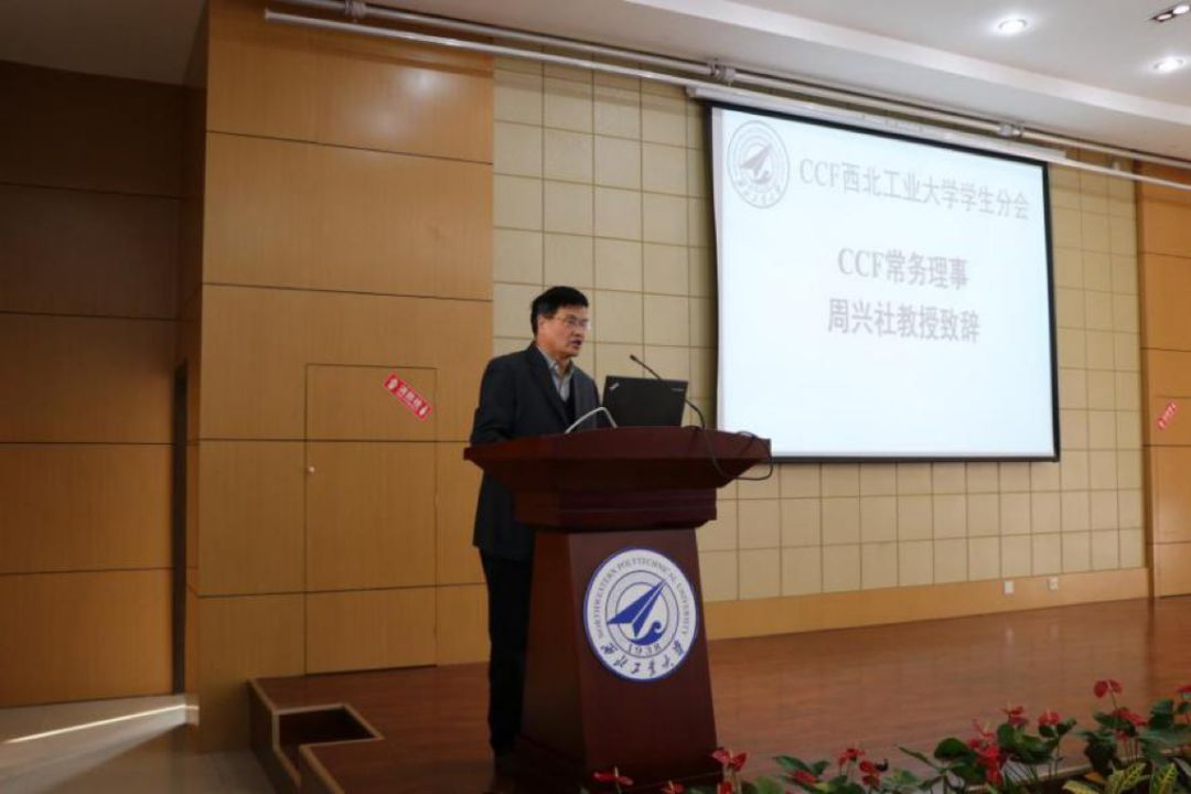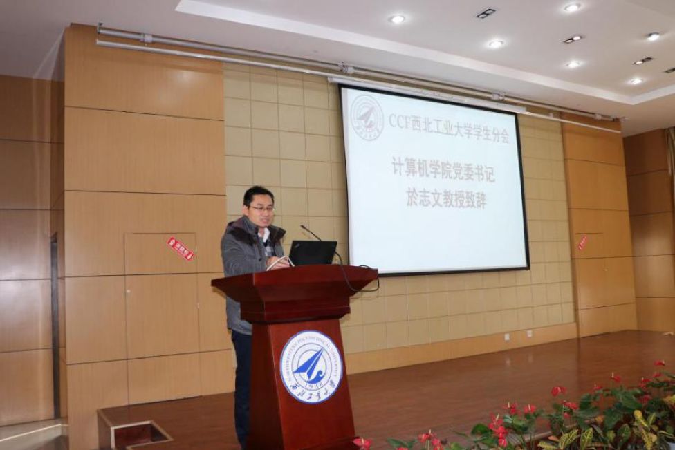 成立仪式上,周兴社教授首先代表中国计算机学会向CCF西北工业大学学生分会的成立表示祝贺,他简要介绍了CCF的发展历程与学会章程,同时对广大学生会员提出了殷切的希望,希望学生会员充分利用好CCF丰富的学术资源,奠定个人专业化、职业化的发展道路,未来成长为CCF的中坚力量。於志文教授代表西北工业大学计算机学院对参会嘉宾的到来表示诚挚的欢迎,并对中国计算机学会对本次学生分会成立工作的大力支持与帮助表达衷心的感谢,同时表示学院将全力支持CCF西北工业大学学生分会开展各项活动。