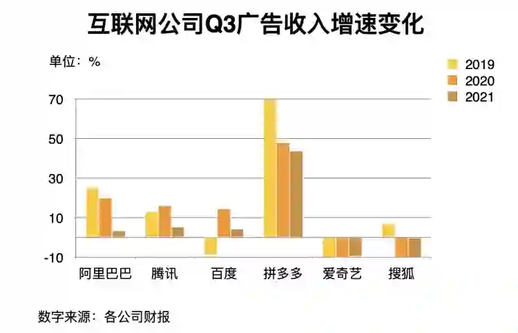 继本就增长放缓的2019年和2020年之后,BAT在内的互联网公司的广告收入增速,在2021年的第三季度集体下降到了个位数,其中阿里巴巴增长了3%,百度增长了6%,腾讯则降至了2017年以来的最低点5%。