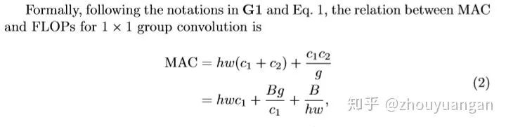 对于1x1的分组卷积(例如:MobileNetv2的深度可分离卷积采用了分组卷积),其MAC和FLOPS的关系为: