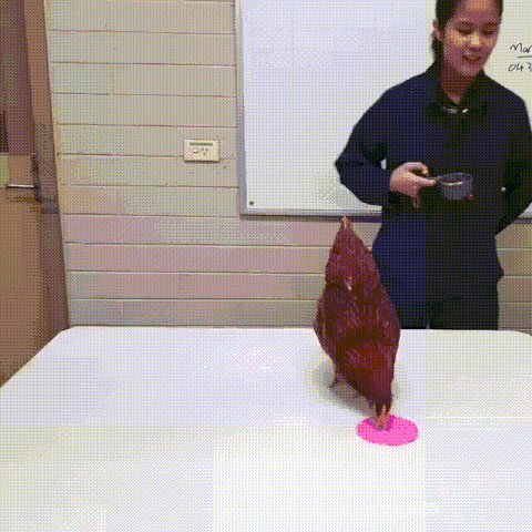 经过一番训练后,这只鸡就一直能正确找到粉色纸片了。