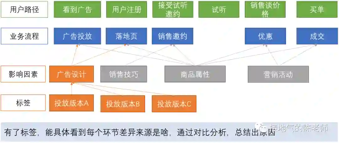 比如做漏斗分析,看到A渠道比B渠道转化好,可怎么解释呢?这时候可以引入一系列标签。比如: