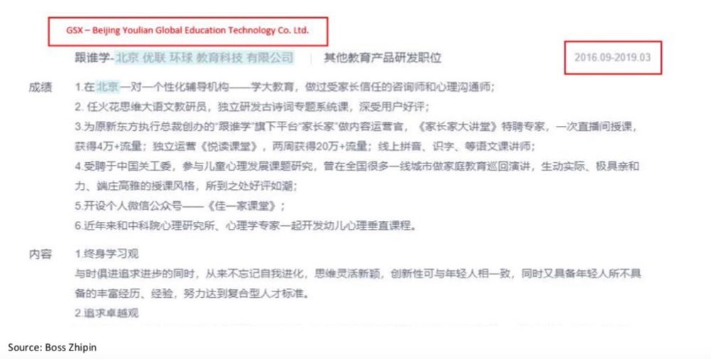 类似这样的内容,Grizzly Research 列举了很多,都暴露跟谁学老师质量并没有宣传中那么好。八、前CFO上市前夕突然离职,继任CFO名声存疑。宋欲晓是原跟谁学财务总监,但是在上市前的几个月就离职了。继任者沈楠于2018年12月入职,其于2017年11月到2018年12月期间担任北京新诺阳光国际文化传播有限公司(经营外教中国)CFO。Grizzly Research 发现外教中国是个骗局,存在不遵守承诺,剥削外国人,故意提供错误签证和从薪水中收取两倍税款,强迫加班等等严重问题。换言之,Grizzly Research 认为沈楠的前东家涉及指控很多,诚信和名誉方面问题较大。九、陈向东于2017年参与设立的2家金融公司,济宁世纪唐人民间资本管理有限公司(持有35%)和济宁慎德泰和民间资本管理有限公司(持有50%)。一直没有在当地拿到营业执照。