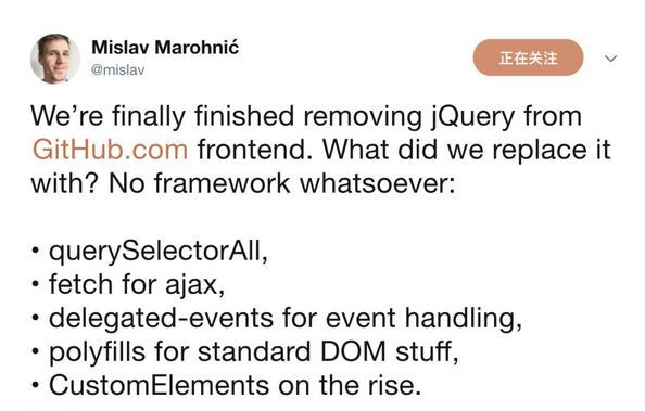 当时 GitHub 的前端团队趁着改版的机会,在重构页面时乘机移除了其中的 jQuery,并且没有使用其它框架来代替 jQuery,而是使用原生 JS: