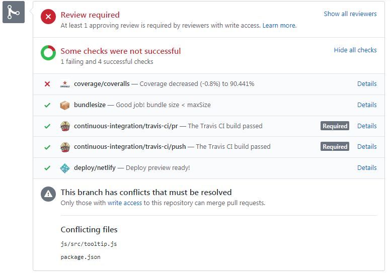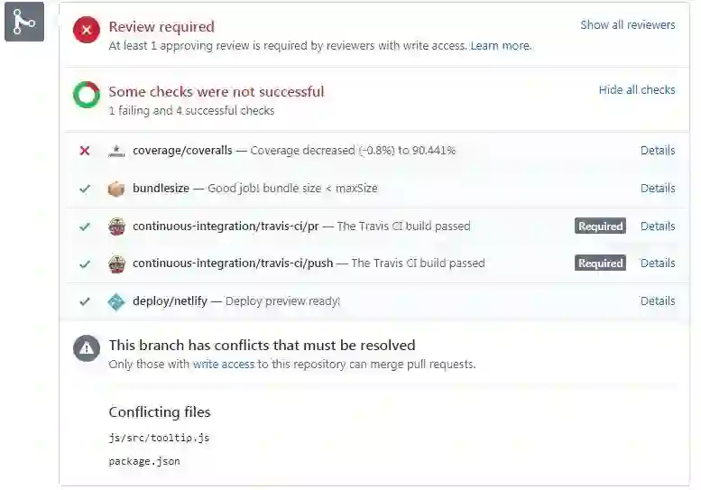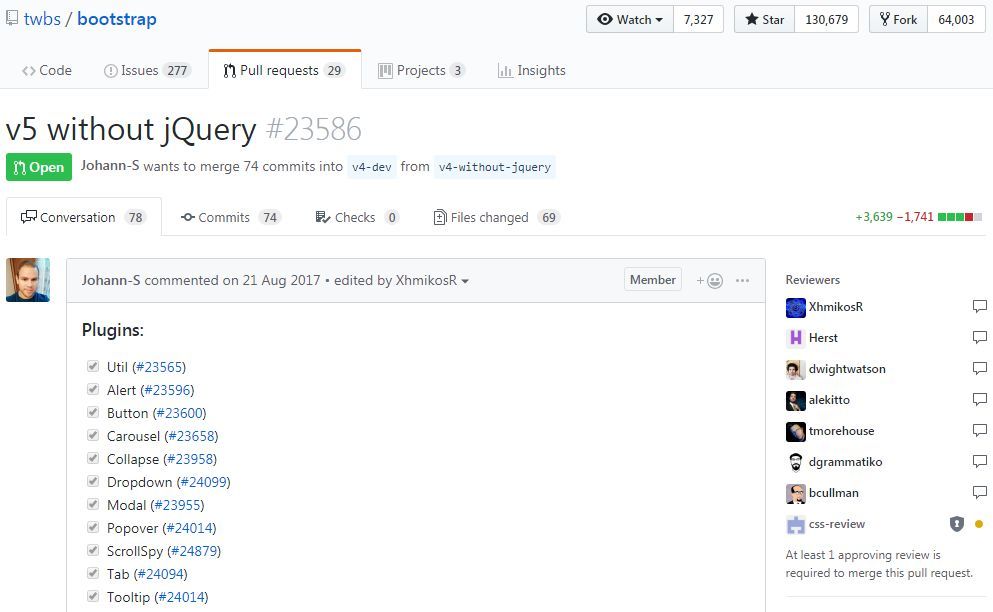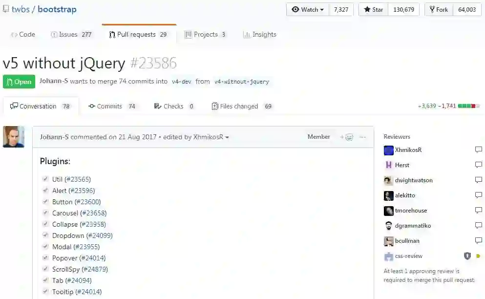 可以看到,在 Bootstrap 5 中移除 jQuery 这个 PR 从提出到今天已经经历了一年半的时间,目前包含了 74 个 commits,正处于 Open 的状态,还有待解决的冲突。
