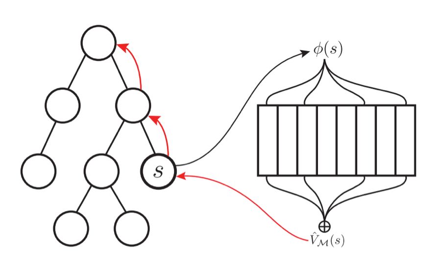 图 1:M-MCTS 的简要图示。当搜索到一个叶状态时,会生成一个特征表征φ(s),然后其被用于询问(query)基于记忆的值近似 V_M(s) hat。V_M(s) hat 被用于根据下式更新 s 和 s 的所有过去状态,如图中的红色箭头所示。