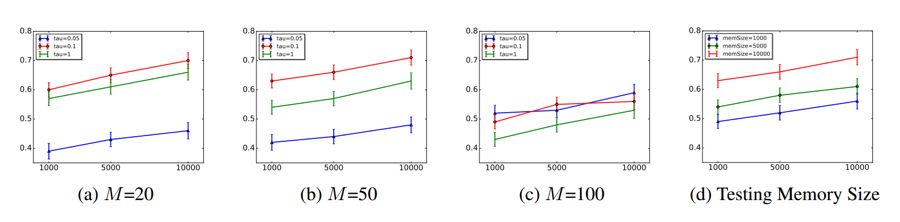 我们每次落子从 {1000, 5000, 10000} 使用不同的模拟次数,实验结果展示在上图 2(a)-(c) 中。在我们使用设定 {M = 50, τ = 0.1} 时获得了最好的结果,它以每次落子进行 10000 次模拟对抗基线算法并实现了 71% 的胜率。此外,我们也探索了不同记忆大小 {1000, 5000, 10000} 的影响。M 和 τ 分别设置为 50 和 0.1,实验结果在上图的 2(d) 中展示。直观上,我们会认为较大的记忆会有更好的性能,因为 query 会包含更多的候选状态,以上的实验结果也证明了这一点。