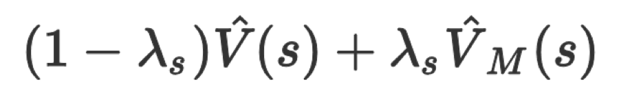 这里,N_M 是近似记忆值 V_M(s) hat 的估计次数。在 MCTS 的 in-tree 树搜索期间,我们使用 取代 V(s) hat 作为状态 s 的值,用于 in-tree 选择,例如在 UCB 公式中。λ_s 是一个延迟参数,确保不存在非对称的偏差。