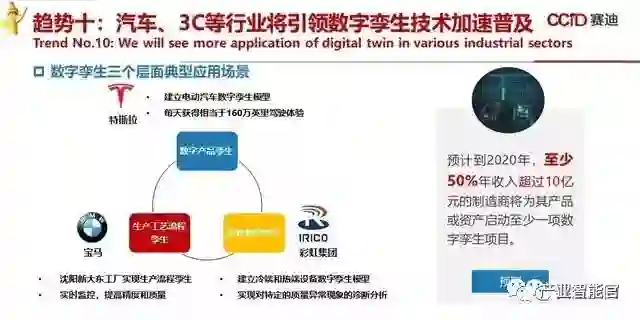数字孪生技术作为企业数字化升级和智能工厂建设的第一选择,将从数字产品孪生、生产制造流程数字孪生和设备数字孪生三个层面,优先在工艺成熟度较高的汽车制造、电子制造领域铺开。预计到2020年,至少50%年收入超过10亿元的制造商将为其产品或资产启动至少一项数字孪生项目。