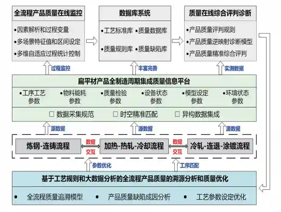 以扁平材为例,其全流程生产制造环节需研究开发的主要技术内容包括:全制造周期集成质量信息平台、全流程产品质量在线监控、质量在线综合评判诊断、全流程产品质量的溯源分析和质量优化(图4)。