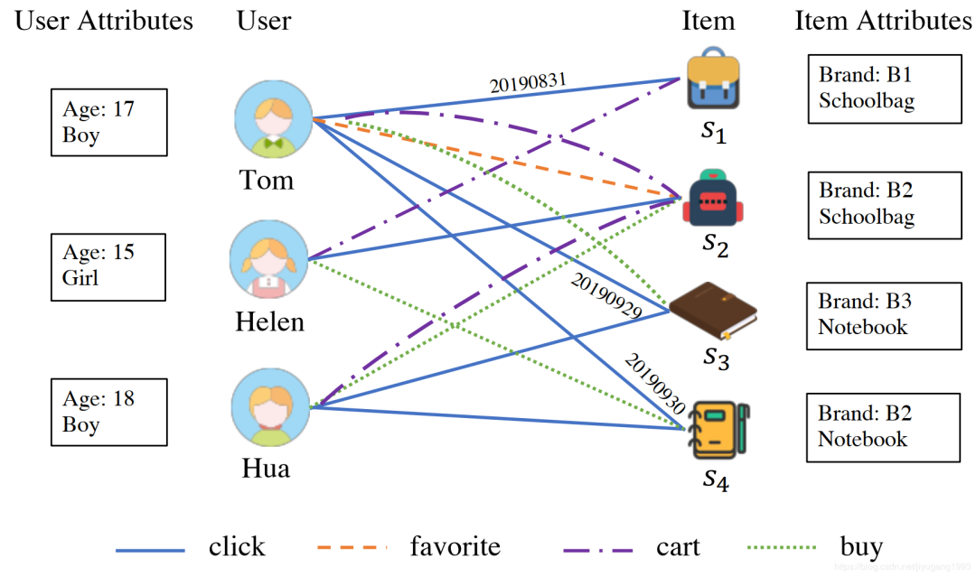 与此同时,另一个问题是,用户和商品之间存在点击、收藏、加入购物车和购买等多种类型的交互行为,蕴含了丰富的结构信息,不同类型的交互行为刻画了用户的多方面偏好和商品的流行度。如图2所示,Hua对于B2品牌的商品更有兴趣,而显然,