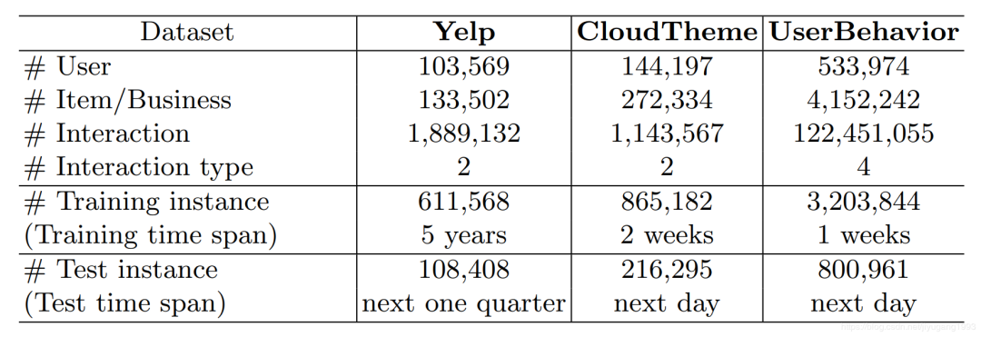 我们在Yelp、CloudTheme和Taobao的用户行为数据上进行商品/商店推荐预测。数据集主要信息如下: