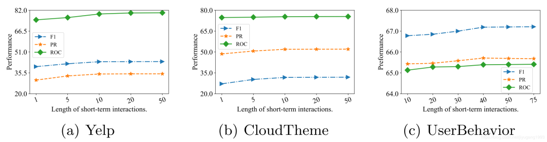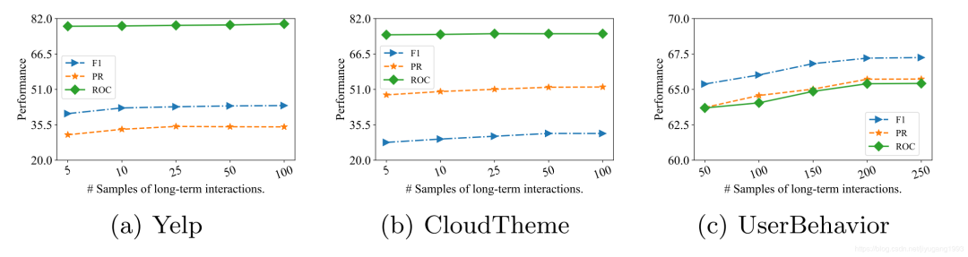 合适的长期行为的采样数量提升了模型的效果,而当采样数量更大时,模型效果不再提升,在Yelp中甚至出现下降的现象。简单地增加长期采样节点的数量并不能持续增加效果,Yelp数据中,一些具有非常多交互行为的用户是异常的,引入了更多的噪声。