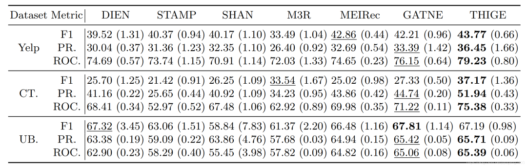 在商品推荐中,我们和近期具有代表性的序列模型(DIEN & STAMP)、长短期模型(SHAN & M3R)和异质图表示学习模型(MEIRec & GATNE)进行比较,定量评价指标为F1、PR-AUC和ROC-AUC,值越大则性能越好。实验结果如下所示: