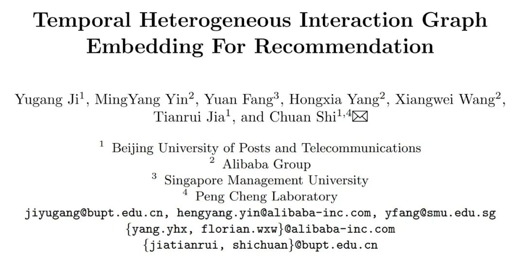 在商品推荐场景中,早先的方法通过建模序列交互的演化来刻画用户兴趣。这些方法在建模复杂动态性方面具有局限性,忽视了长期行为习惯对短期兴趣的影响;忽视了用户和商品之间交互行为的类型,只考虑单一的、短期的交互行为。在本文中,我们将复杂异质的动态交互行为构建为时序异质交互图(Temporal Heterogeneous Interaction Graph, 简称为THIG)进而同时学习用户兴趣和商品表示用于商品推荐。本文提出了一种时序异质图上的表示学习方法,称之为THIGE,充分建模交互行为的异质性,刻画不同类型的兴趣偏好,并融合长、短期兴趣构建用户、商品表示。最后,在3个真实数据集上验证模型的有效性。