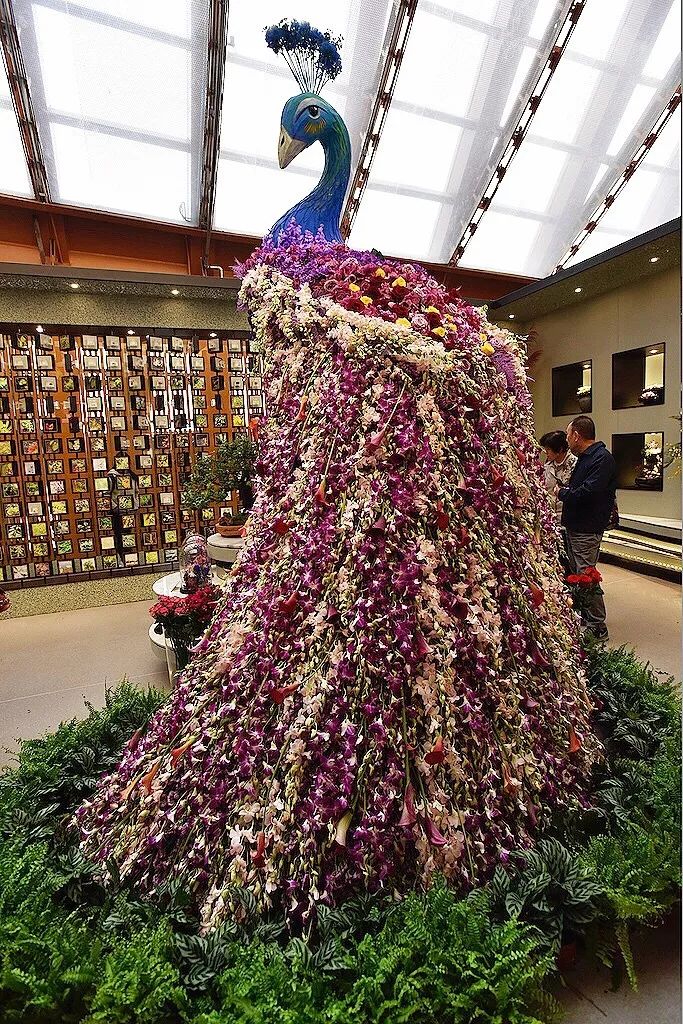 层层叠叠的紫藤、洋桔梗让这只孔雀看上去栩栩如生。