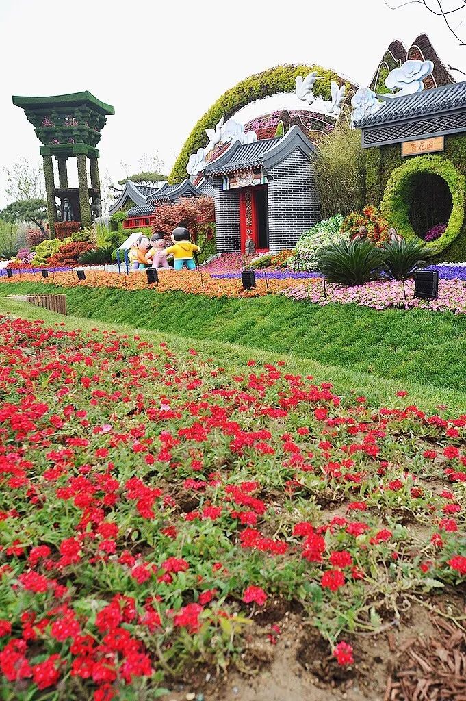 世园会内部几乎可以说是一步一景,路边有围绕植物为主角所创造的生活场景,在园艺师的手中,形色各异的植物被设计成了彩虹、云朵、山峰、孔雀的样子,不得不佩服他们的想象力。