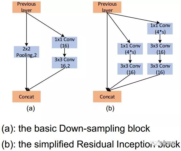 基本的下采样模块主要应用在网络的早期,用来快速下采样从而减少计算量,同时改善特征表达能力。简化版的残差Inception模块使用了更少的通道数,在每次下采样的时候通过两个1x1的维度扩充卷积、动态的增加一倍的通道数,用来补偿空间分辨率损失。