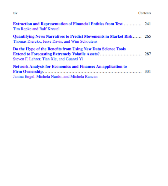 这本开放获取的书籍涵盖了数据科学在经济和金融领域的应用,包括高级机器学习、大数据分析、语义网技术、自然语言处理、社交媒体分析、时间序列分析等。此外,它还展示了先进数据科学解决方案的一些成功应用,这些解决方案用于从数据中提取新知识,以改进经济预测模型。