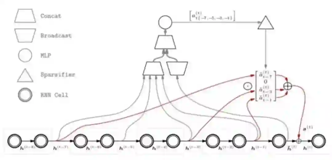 在前馈传播过程中,管理一个内存单元,并在每个时间步中最多选择过去记忆中的一个稀疏子集。这个过程称之为稀疏检索。