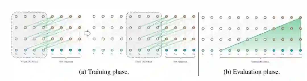 以往的 Transformer 网络由于受到上下文长度固定的限制,学习长期以来关系的潜力有限。谷歌的Transformer-XL: Attentive Language Models Beyond a Fixed-Length Context提出的新神经架构 Transformer-XL 可以在不引起时间混乱的前提下,可以超越固定长度去学习依赖性,同时还能解决上下文碎片化问题。具体地说,此方法在 Transformer 架构中引入了循环机制。在训练过程中,为之前的片段计算的隐藏状态序列是固定的,将其缓存起来,并在模型处理后面的新片段时作为扩展上下文重复使用,如下图所示: