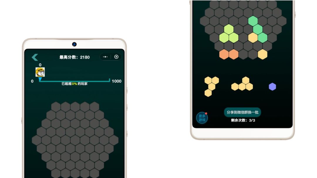 欢乐六边形的填充图样是个正六边形,其中又整齐堆放着多个小六边形。我们需要做的就是将游戏每次提供的三个不规则且不可变形的图形,填充到大六边形中,当正六边形中任意任意一条线上的小六边形被全部填充满以后即可实现消除。