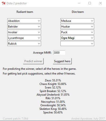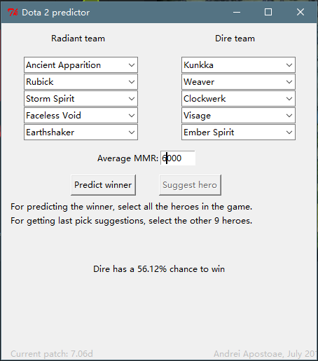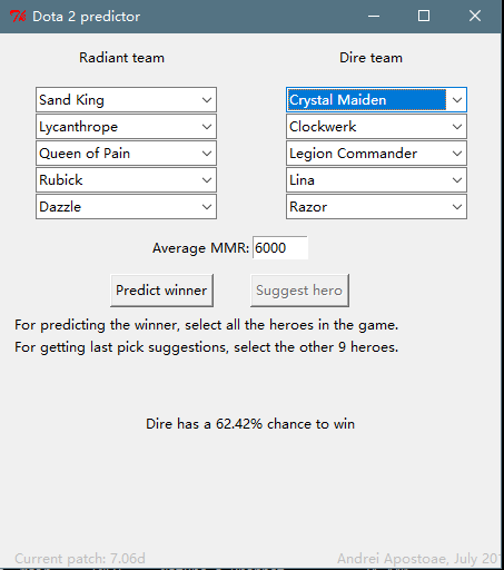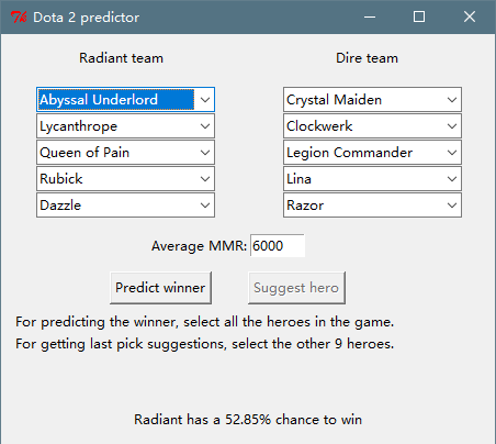 Reddit上面的网友Andrei Apostoae刚刚发布了一个很有意思的机器学习项目(网站地址见文末),叫做Dota2 Predictor。这个项目就是使用机器学习中的神经网络以及逻辑回归方法,通过分析50万场Dota2比赛来帮助大家选择比赛中的最后一个英雄,以及针对对战双方的英雄阵容来预测比赛胜率。这个使用Python编写的程序同时提供了GUI界面,其界面如下: