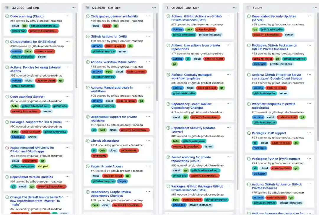 roadmap 是 GitHub 公布的产品路线图,你可以了解到 GitHub 官方正在开发什么功能。官方按照季度,罗列了 2020 Q3- 2021 年 Q1 GitHub Actions、GitHub Docs、GitHub Packages、GitHub Pages 的开发任务安排。